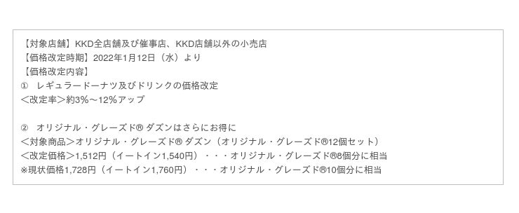 クリスピー・クリーム・ドーナツ・ジャパン株式会社(本社:東京都渋谷区、代表取締役社長:若月 貴子、以下:KKDJ)は、2022年1月12日(水)からクリスピー・クリーム・ドーナツ(以下:KKD)店舗及び催事店、KKD店舗以外の小売店で販売する商品の価格を改定いたします。
