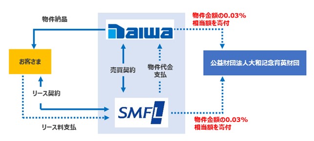 大和冷機工業版「SDGsリース『みらい2030(R)』(寄付型)」は、大和冷機工業とSMFLが提携してお客さまと締結したリース契約を対象に、物件金額の0.06%相当額を、公益財団法人大和記念育英財団(以下「大和記念育英財団」)に2社合同で寄付します。大和記念育英財団は、経済的理由で進学困難な学生に奨学金支援を行う団体であり、大和冷機工業が設立以来支援しています。今回の取り組みにより、リース契約を通じて、CO2排出を抑えた省エネ機器の普及による環境負荷軽減と、大和記念育英財団への寄付を通じた学生支援による社会貢献を行うことで、SDGsの実現を支援します。