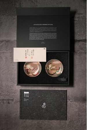 京焼・茶の湯道具を3代にわたって手がける龍谷窯 宮川香雲氏が作陶した皿に、瓢亭14代当主の高橋英一氏が瓢箪の図柄を絵付けした限定品を特別に製作。二人の直筆サインと落款も添えた、『京都百年書』でしか手に入らない銘々皿2客と共にお届けします。
