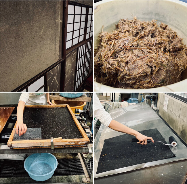 表紙には、数奇屋造りの親席(瓢亭)で見られる、藁が美しく浮き出た「土壁」を表現した和紙を使用。土壁の素材と同じ、京都・西陣地区で取れる希少な聚楽度と投げ苆(藁)を左官職人から譲り受け、漉き込んだ特注の阿波和紙の質感をお楽しみください。