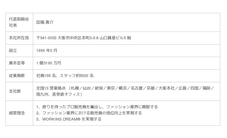 1999 年3 月に設立した、アパレル・ファッション・コスメ業界に特化したプロフェッショナルカンパニー。業界スペシャリティとして唯一47 都道府県を網羅し、キメ細やかなサービスを提供、独自の地位を築いてきました。ファッション・コスメ業界の数多くの著名ブランドの人材パートナーとして、 1500 社以上の取引先企業からの支持を得ており、人材紹介・人材派遣・教育・店舗運営・出店コンサルティング等を行っています。