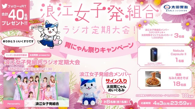 株式会社太田胃散(本社:東京都文京区/代表取締役社長:太田淳之)は、「浪江女子発組合ラジオ定期大会!」胃にゃん祭りキャンペーン」として、浪江女子発組合のメンバーサイン入り「太田胃にゃんぬいぐるみ」や「浪江女子発組合メンバースタジオチェキ+太田胃散オリジナルQUOカード1,000円分」、「Nebula Capsule II」、「なみえ焼きそば」、「太田胃散オリジナルQUOカード 2,000円分」が当たるキャンペーンを3/23(金)ツイート投稿時〜4/3 (月)23:59の期間実施します。
