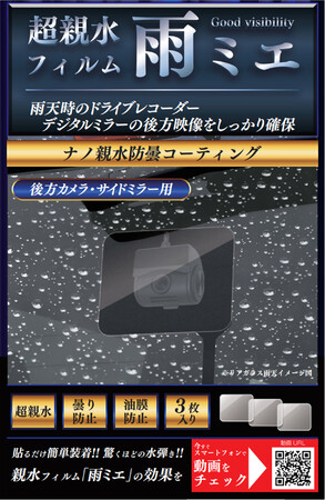 超親水フィルムは3枚入りでカットして使うことも可能です。後方カメラはもちろんサイドミラーの視界確保にもお使いいただけます。