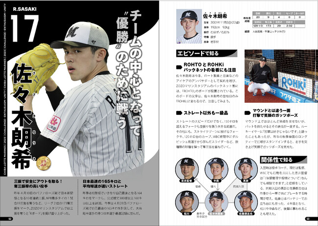 『まり〜んずかん2023』は、千葉ロッテマリーンズの所属選手のみを紹介する「選手の図鑑」です。マリーンズ一筋のベテランからルーキー、新外国人選手や育成選手まで、全ての選手を「人となりがわかるエピソード」を中心に、選手ごとの個別ページで掲載。期待の若手選手の対談など計10選手の独占インタビューも掲載。図鑑で選手を知ることで、より選手を身近に感じられるため、球場観戦のお供に最適で、テレビ・ネット観戦でも試合をもっと楽しめます。