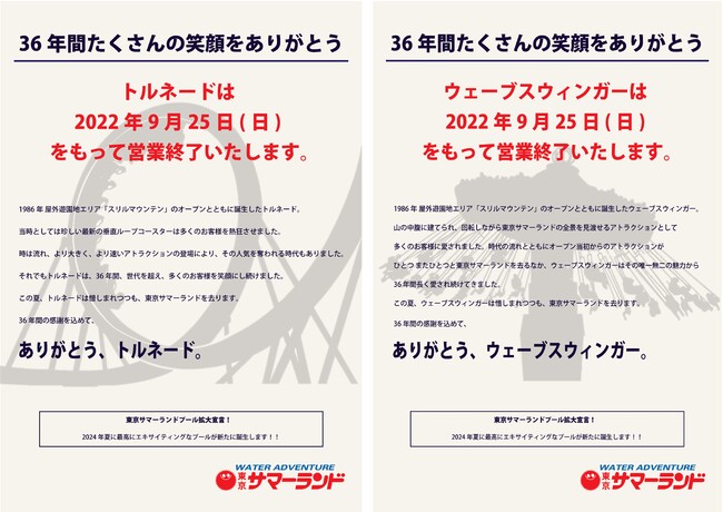 1986年の屋外遊園地「スリルマウンテン」オープン以来、多くのお客様に親しまれてきた2機種への感謝を表すとともに、2024年にオープンする新たなプールへの期待を込めたキャンペーンとなっています。