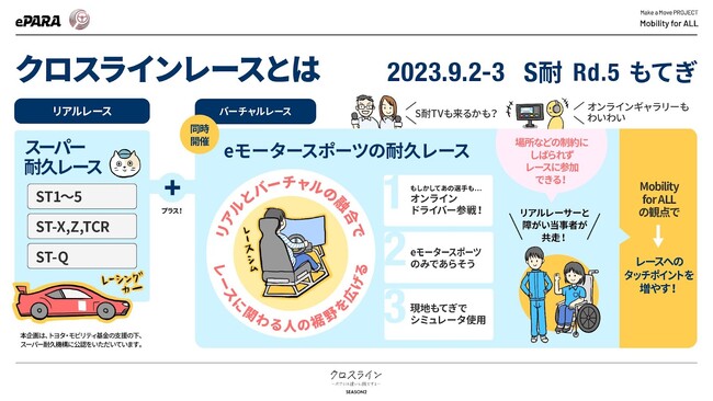 ePARAは、「Mobility for ALL〜 移動の可能性を、すべての人に。」部門のファイナリストとしての採択を受け、2023年1月よりSEASON2を行っています。SEASON2では、スーパー耐久機構事務局(STO)公認のもと、第5戦もてぎスーパー耐久との同時スタートによるeモーターレースを実施します。サーキットが見えるモビリティリゾートもてぎの施設内でeモータースポーツの耐久レースを行うことで、年齢・性別・時間・場所・障害の有無を問わずにeレーサーに挑戦できる「舞台」としての進化を目指します。