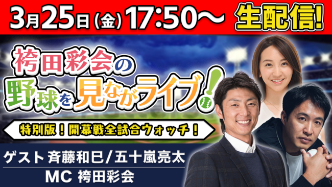 プロ野球開幕特別番組「袴田彩会の野球を見ながライブ」、斉藤和巳さんと五十嵐亮太さんをゲストに迎え3月25日(金)17時50分より生配信!
