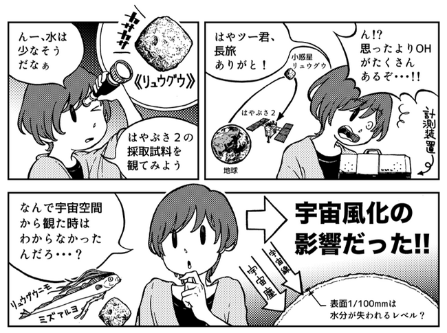 ・その原因は大気のないリュウグウ表面が宇宙線や宇宙塵にさらされて変質(宇宙風化)したこと