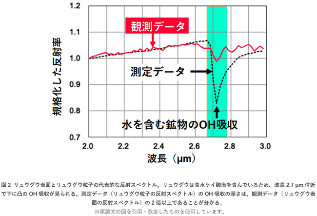 本研究では、「はやぶさ2」搭載機器のONC-TとNIRS3がリュウグウの赤道付近を上空から観測して取得した可視〜近赤外域の反射スペクトルと、リュウグウ粒子を測定して得られた反射スペクトルを直接比較しました(図1、図2)。その結果、明るさやスペクトルの傾きなどの特徴は大変よく似ている一方で、水を含む粘土鉱物(含水ケイ酸塩)の存在を示すOH吸収に2倍以上の深さの違いが見られました(図2)。