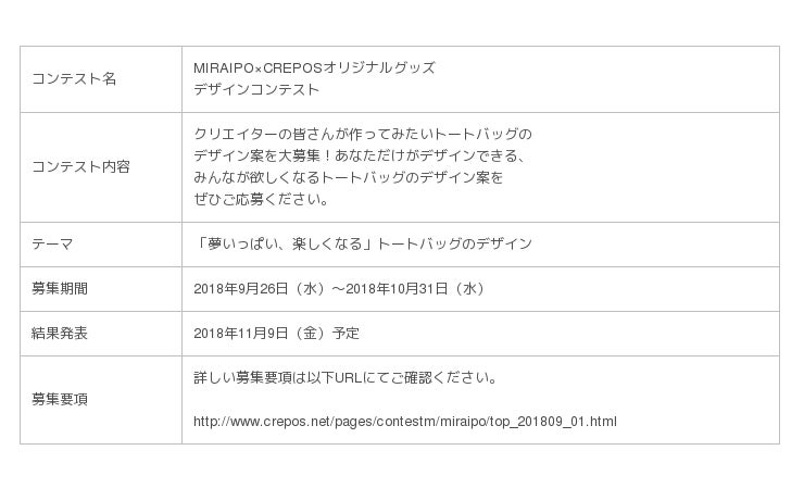 オープン記念キャンペーンとして、2018年9月26日(水)より、当社のクリエイター支援サイト「CREPOS(クリポス)」の登録クリエイターを対象に「オリジナルグッズ・デザインコンテスト」を開催します。