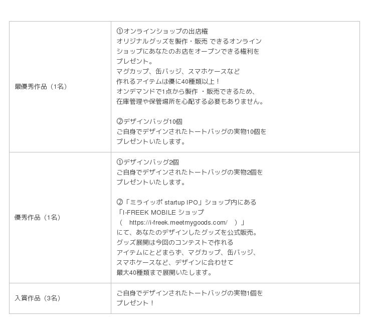 コンテスト最優秀者へは、実際にデザインしたグッズを10点プレゼント!さらに、1点から自分の作品をプリントして、オリジナルグッズの製作・販売ができるオンラインショップへの出店権を用意しています。ぜひこれを機会にご応募ください。