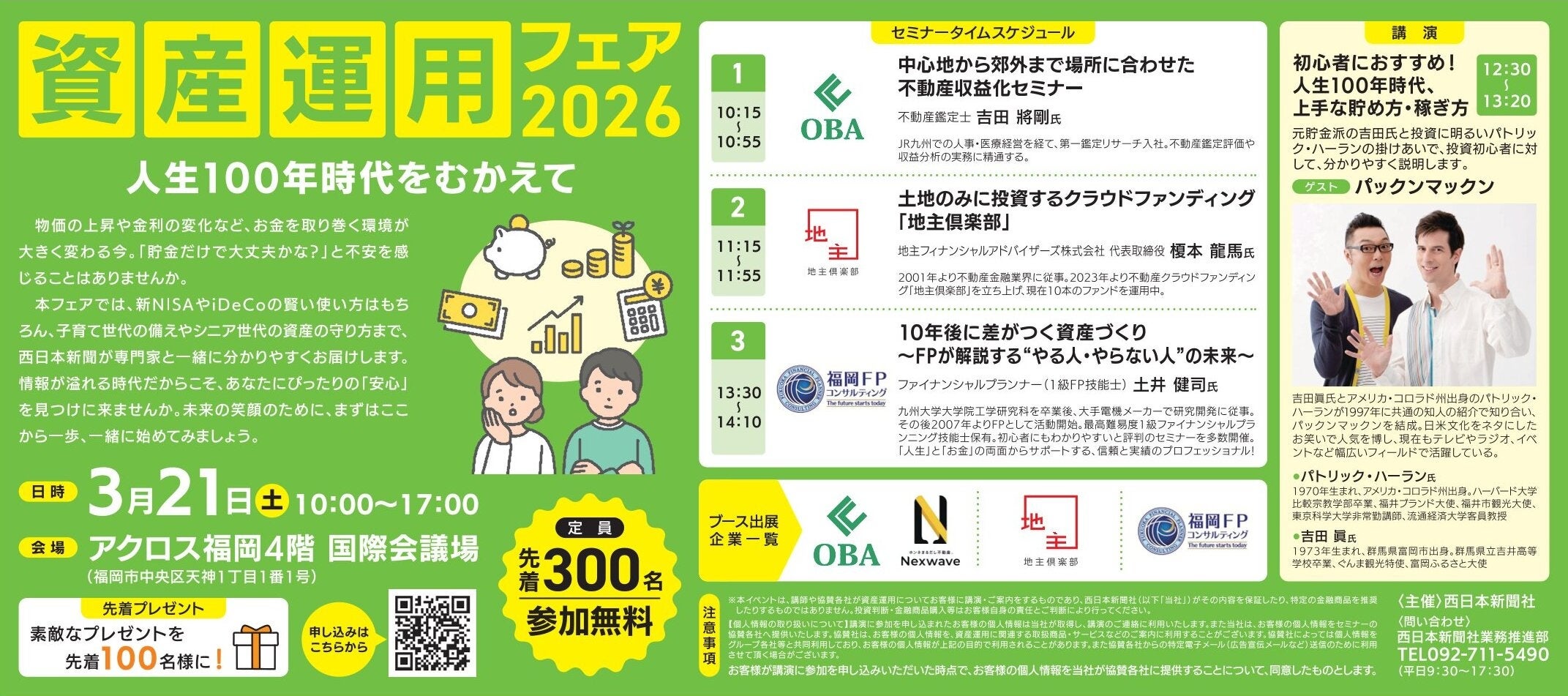 ネクスウェイブ株式会社(本社:福岡県福岡市、代表:木下晃一)は、西日本新聞社が主催する「資産運用フェア 2026」に出展することが決定しましたのでお知らせします。