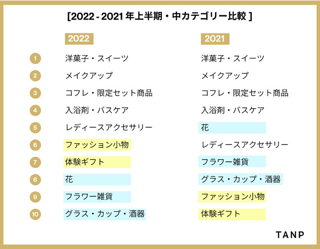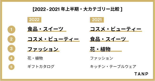 2022年1月〜6月において、TANPサービス内で人気の高いギフトカテゴリー上位は以下の通りとなりました(※1)。大カテゴリーではギフトとして想起されやすい「定番ギフト」が昨年に劣らず人気の高いカテゴリーとして上がっています。