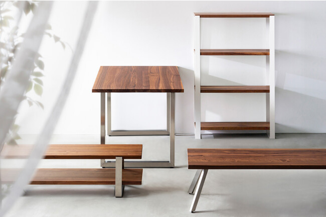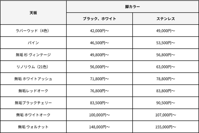 天板の奥行が固定だった当シリーズは、幅・奥行の両方を1cmごとに無料サイズオーダーが可能に。また、天板・脚の種類も刷新し、組み合わせ数は17通りから315通りへ増加しました。