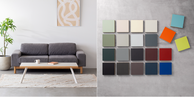 アマニ油など天然の原材料から作られた自然素材。抗菌・抗ウイルス・脱臭・抗アレルギー性等に優れている*という特徴があります。21色展開で、木口はオークとウォルナットの2種類から選べます。