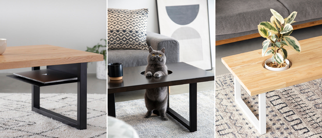 また、猫と一緒に遊べる「ネコ穴付きローテーブル」や、観葉植物や小物収納となる「ワイヤーバスケット+鉢カバー付きローテーブル(2023/8/24発売)」もございます。