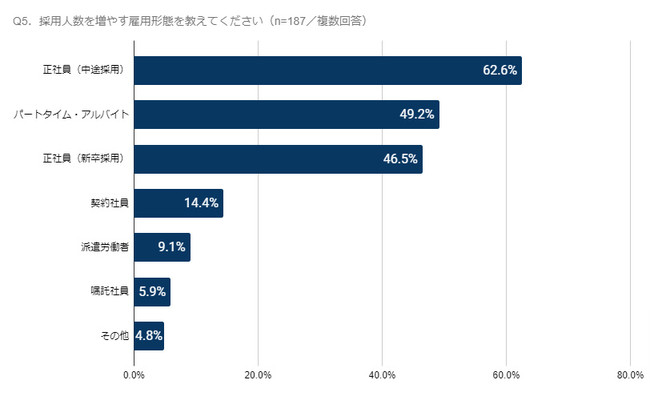 引き続き、採用人数を増やす予定の事業所(n=187)へ、雇用形態について質問しました。もっとも多かったのは「正社員(中途採用)」で、半数以上の事業所が回答。