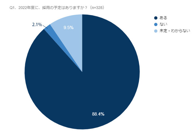 はじめに、2022年度(2022年4月〜2023年3月)の採用予定について質問しました(n=328)。採用の予定が「ある」と回答した事業所は、88.4%。中小企業の大多数が人材採用を予定していることが明らかになりました。