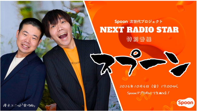 音声配信アプリ「Spoon」を展開する、株式会社Spoon Radio Japan(本社:東京都千代田区)は、Spoon次世代プロジェクトNEXT RADIO STAR特別番組『スプーン』を10月4日(金)配信します。オールナイトニッポンなど数々の人気番組を担当する高井均氏と話題の漫才ユニット「食べ物」(岡田康太、高垣雄海)がタッグを組んだ特別番組です。また番組配信に合わせ「NEXT RADIO STAR」の最終募集が開始されます。番組を見て、 一緒にNEXT RADIO STARを盛り上げましょう!