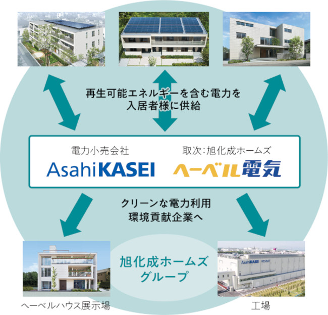 「Ecoレジグリッド」は、ZEH-M要件を満たす賃貸住宅「ヘーベルメゾン」の建築主から当社が30年間屋根等を賃借し、太陽光発電設備と蓄電池を設置のうえ所有・管理します。そしてグループ独自の電力売買事業「ヘーベル電気」を通じて入居者に販売し、余剰電力は旭化成ホームズグループの事業活動に活用するシステムです。
