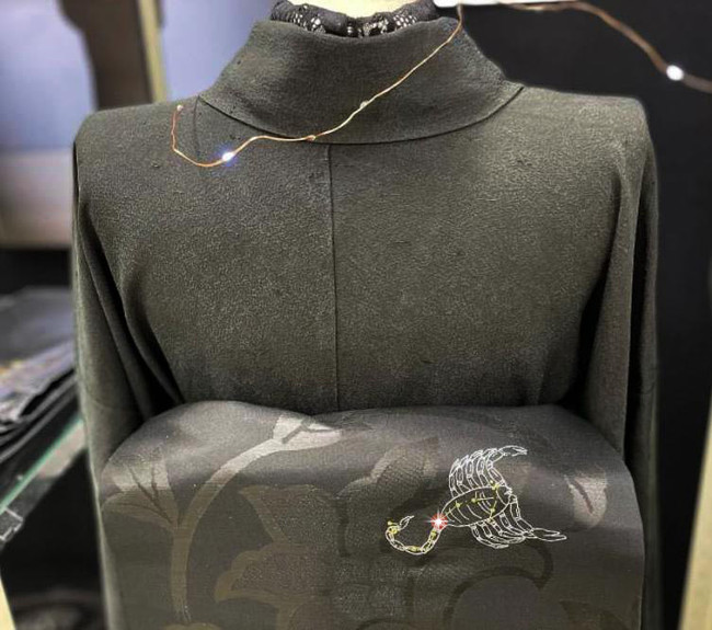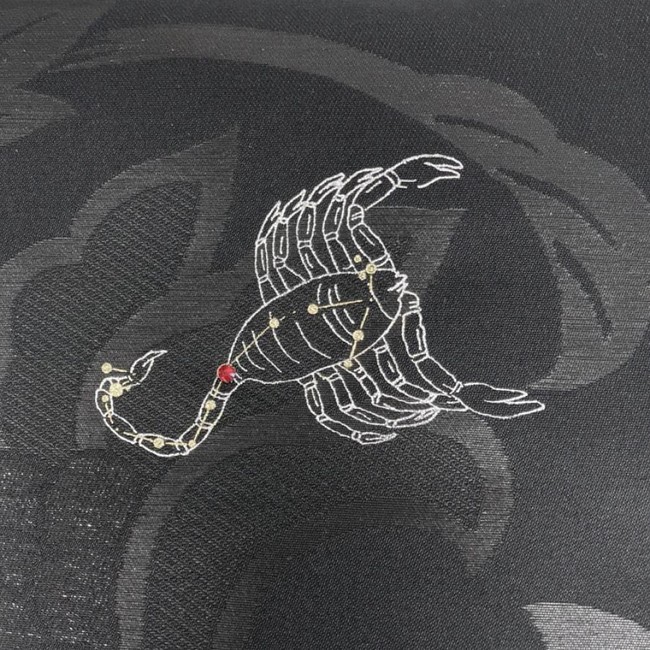 リユース着物専門店「たんす屋」のSDGsへの取り組みの1つとなる黒染め着物ブランド「キモノアール」から、「12星座の名古屋帯」が試験的に販売。各星座ごとに1枚のみ制作の希少品です。本商品は、喪服で用いる黒の喪帯「黒共帯」に対して、職人が星座デザインで金彩、銀彩の型染めを施しています。さらにスワロフスキーを一粒アクセントに施し、黒地に上品にキラキラと映える帯ができあがりました。キモノアール着物との相性も良いので、ぜひお試しください。