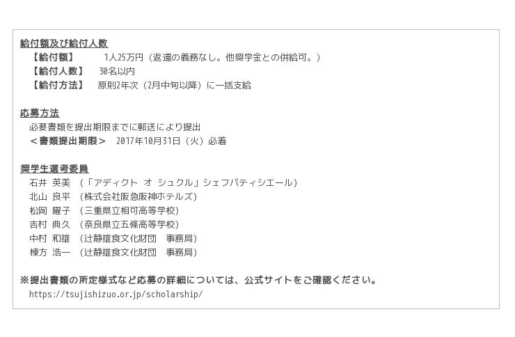 食分野の教育と研究に生涯を捧げた辻調グループ創設者・辻静雄の志を受け継ぎ、2015年9月に設立された「一般財団法人辻静雄食文化財団」では、2017年度の“次世代リーダーシェフ育成奨学金”の申込み受付を開始しましたのでお知らせ致します。