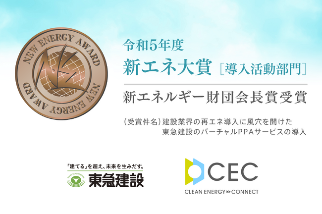 東急建設株式会社(代表取締役社長:寺田光宏、以下「東急建設」)と株式会社クリーンエナジーコネクト(代表取締役:内田鉄平、以下「クリーンエナジーコネクト」)は、「令和5年度 新エネ大賞」の新エネルギー財団会長賞[導入活動部門]を共同で受賞しました。