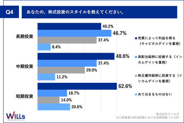 「Q4.あなたの、株式投資のスタイルを教えてください。(複数回答)」(n=107)と質問したところ、長期投資では、「高配当銘柄に投資する(インカムゲインを重視)」が46.7%、「売買によって利益を得る(キャピタルゲインを重視)」が40.2%、中期投資では、「売買によって利益を得る(キャピタルゲインを重視)」が48.6%、「高配当銘柄に投資する(インカムゲインを重視)」が37.4%、「株主優待銘柄に投資する(インカムゲインを重視)」が29.9%、短期投資では、「売買によって利益を得る(キャピタルゲインを重視)」が62.6%、「あてはまるものはない」が20.6%という回答となりました。