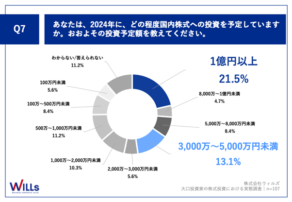 「Q7.あなたは、2024年に、どの程度国内株式への投資を予定していますか。おおよその投資予定額を教えてください。」(n=107)と質問したところ、「1億円以上」が21.5%、「3,000万〜5,000万円未満」が13.1%という回答となりました。
