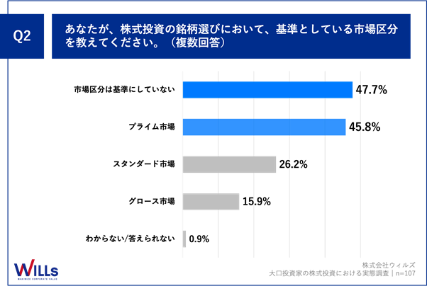 「Q2.あなたが、株式投資の銘柄選びにおいて、基準としている市場区分を教えてください。(複数回答)」(n=107)と質問したところ、「市場区分は基準にしていない」が47.7%、「プライム市場」が45.8%、「スタンダード市場」が26.2%という回答となりました。