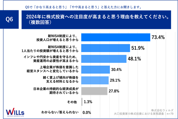 Q5で「かなり高まると思う」「やや高まると思う」と回答した方に、「Q6.2024年に株式投資への注目度が高まると思う理由を教えてください。(複数回答)」(n=79)と質問したところ、「新NISA制度により、投資人口が増えると思うから」が73.4%、「新NISA制度により、1人当たりの投資額が増えると思うから」が51.9%、「インフレや円安から資産を守るため、資産運用の必要性が高まるから」が48.1%という回答となりました。