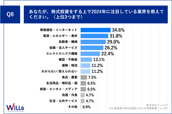 「Q8.あなたが、株式投資をする上で2024年に注目している業界を教えてください。(上位3つまで)」(n=107)と質問したところ、「情報通信・インターネット」が34.6%、「資源・エネルギー・素材」が31.8%、「自動車・機械」が29.0%という回答となりました。