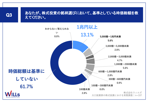 「Q3.あなたが、株式投資の銘柄選びにおいて、基準としている時価総額を教えてください。」(n=107)と質問したところ、「時価総額は基準にしていない」が61.7%、「1兆円以上」が13.1%という回答となりました。