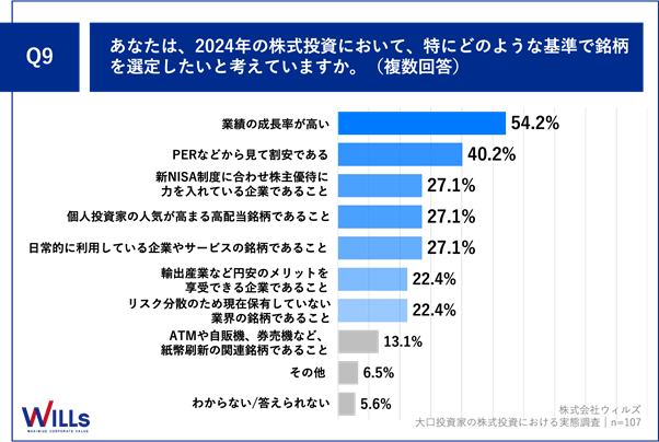 「Q9.あなたは、2024年の株式投資において、特にどのような基準で銘柄を選定したいと考えていますか。(複数回答)」(n=107)と質問したところ、「業績の成長率が高い」が54.2%、「PERなどから見て割安である」が40.2%、「新NISA制度に合わせ株主優待に力を入れている企業であること」が27.1%という回答となりました。