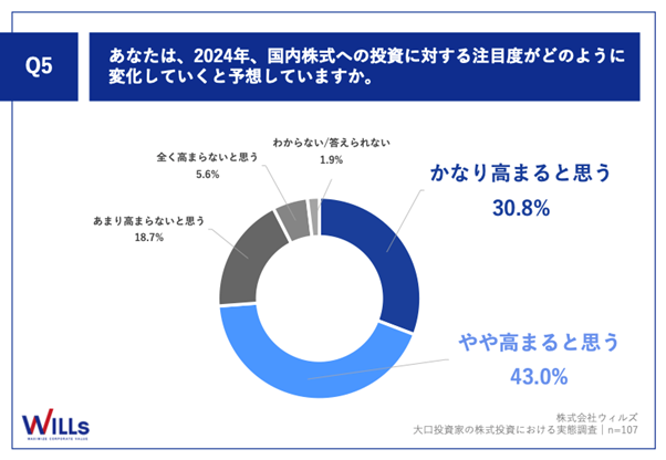 「Q5.あなたは、2024年、国内株式への投資に対する注目度がどのように変化していくと予想していますか。」(n=107)と質問したところ、「かなり高まると思う」が30.8%、「やや高まると思う」が43.0%という回答となりました。