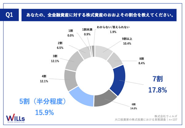 「Q1.あなたの、全金融資産に対する株式資産のおおよその割合を教えてください。」(n=107)と質問したところ、「7割」が17.8%、「5割(半分程度)」が15.9%という回答となりました。
