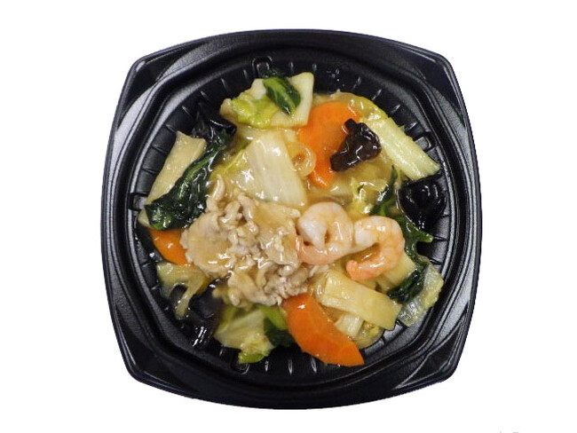 6種類の野菜とえび、豚肉を使用した、餡も具材もたっぷりの中華丼です。しょうゆベースに、中華だし、にんにく、ごま油で、旨味と香りを加えたこだわりの中華餡を使うことで深みのある味わいに仕上げました。