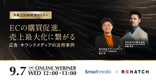 SaaS型CMS事業を展開する株式会社スマートメディア(本社: 東京都港区、代表取締役社長:成井 五久実)は、広告やデータ分析プラットフォームを用いて企業の売上拡大を支援するデジタルマーケティング支援の会社「REHATCH株式会社」と、ECの購買促進、売上最大化につながる広告・オウンドメディアの活用事例を紹介する無料オンライン共催セミナーを9月7日(水)に開催します。