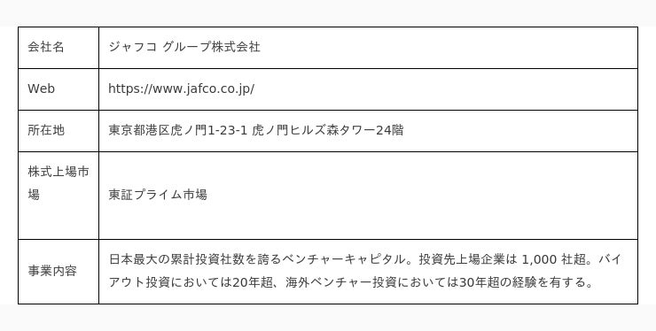 ジャフコ グループ株式会社(本社:東京都港区、取締役社長:三好啓介)は、その管理・運営するファンド(ジャフコSV6投資事業有限責任組合およびジャフコSV6-S投資事業有限責任組合。以下「ジャフコ」)の投資先である株式会社ナルネットコミュニケーションズ(本社:愛知県春日井市、代表取締役社長:鈴木隆志。以下「ナルネットコミュニケーションズ」)の発行済株式のうち36.0%を、伊藤忠商事株式会社(本社:東京都港区、代表取締役社長COO:石井敬太)および伊藤忠エネクス株式会社(本社:東京都千代田区、代表取締役社長CEO:吉田朋史)が共同で出資・設立するMobility & Maintenance Japan株式会社(本社:東京都港区、代表取締役:合六渉、以下「MMJ」)に譲渡する契約を締結いたしましたので、お知らせいたします。