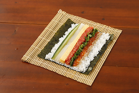 恵方巻の起源に基づき、「海老・国産サーモン・まぐろねぎとろ・イカ・日替わり鮮魚・玉子・きゅうり」の7種の具材を使用。