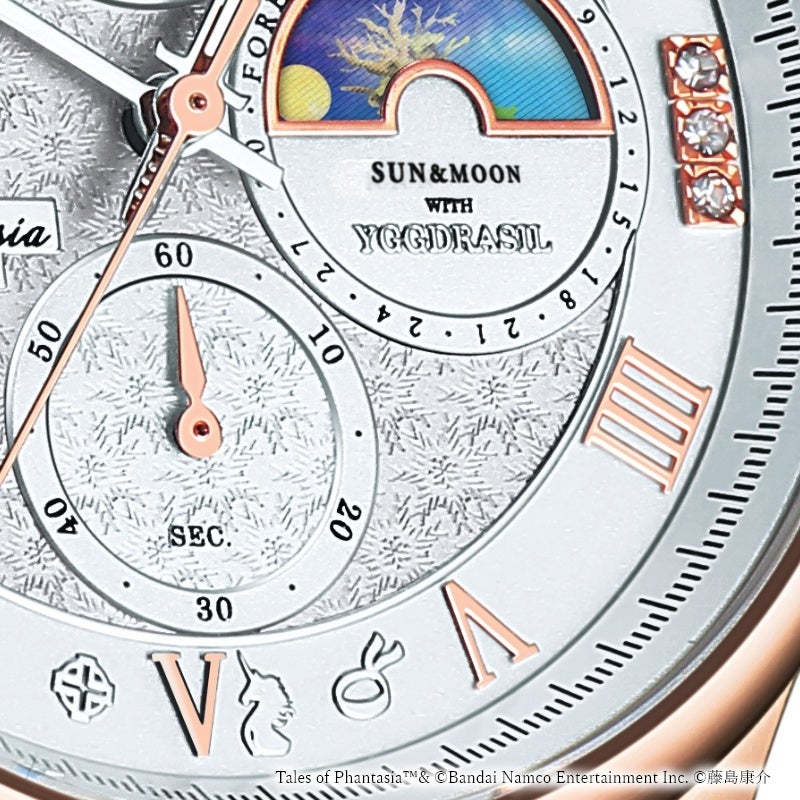 3時位置には、世界樹ユグドラシルをモチーフにした、ドット絵風の大樹をあしらったサン&ムーン機構を搭載。