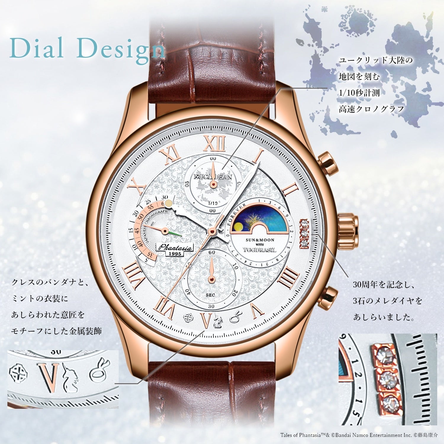 壮大に広がるユークリッド大陸。世界樹ユグドラシル。常闇の町アーリィに、静かに降り積もる雪。 『テイルズ オブ』シリーズの第一作「テイルズ オブ ファンタジア」が描いた情景を、腕元からもう一度思い出していただきたい。そんな願いを込めてつくり上げた一本です。