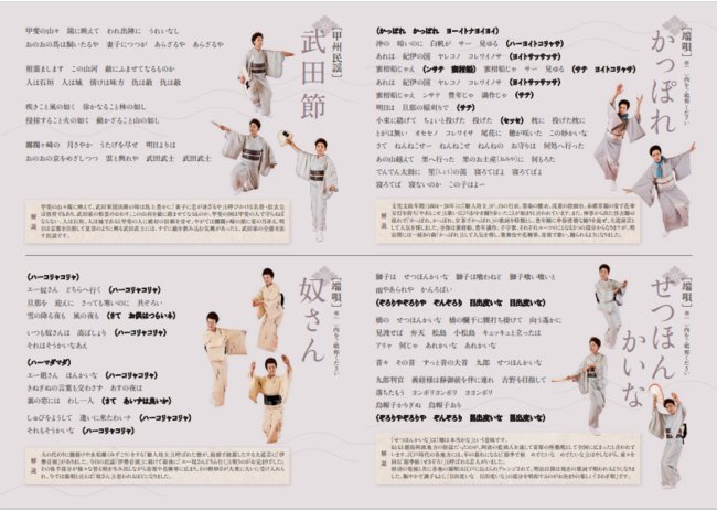 本リーフレットは、今後、観光イベントやお座敷での演舞披露の際に活用していきます。その手始めとして、次のイベントでリーフレットを配布し、来場者に活用していただくこととしております。