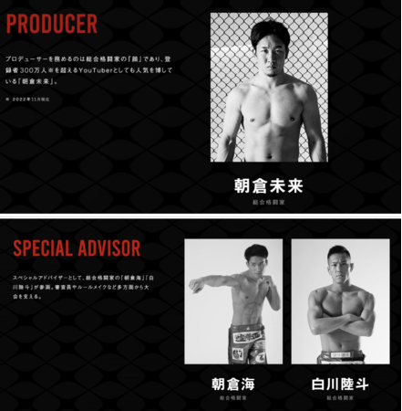 同大会はYUGOが総合プロデュースを、そして登録者数300万人超え(2022年11月現在)の人気YouTuberでもある総合格闘家の朝倉未来がプロデューサーを務め、スペシャルアドバイザーとして総合格闘家の朝倉海、総合格闘家の白川陸斗が参画しています。