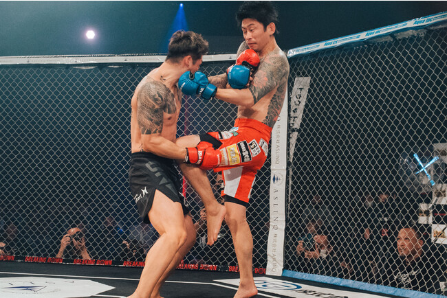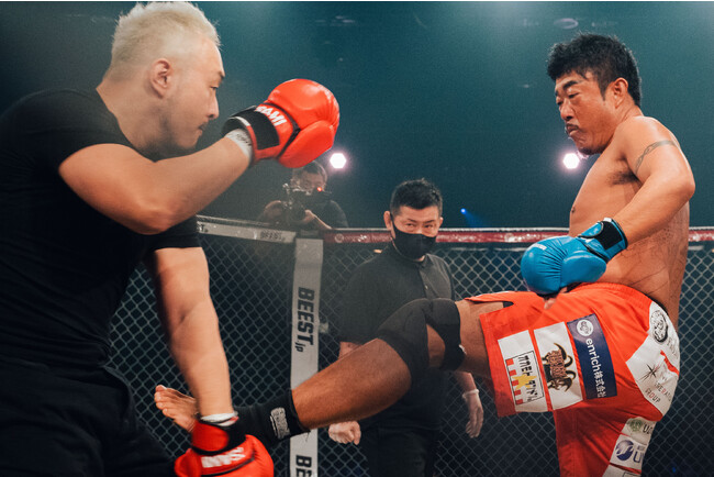 第2戦は「インテリジェンスタイガー 秀虎」選手対「Mr.BreakingDown 川島悠汰」選手の一戦です。飛び膝蹴りから試合をスタートさせ、キックを交えながら戦う秀虎選手に、川島選手は得意の打撃で真正面から立ち向かいダウンを奪います。しかし、同じく打撃で秀虎選手がすぐにダウンを奪い返しました。互いに一歩も引かない白熱した戦いに、会場もさらなる盛り上がりを見せました。最終的には打撃をより多く当てていた川島選手が4-0で判定勝利しました。