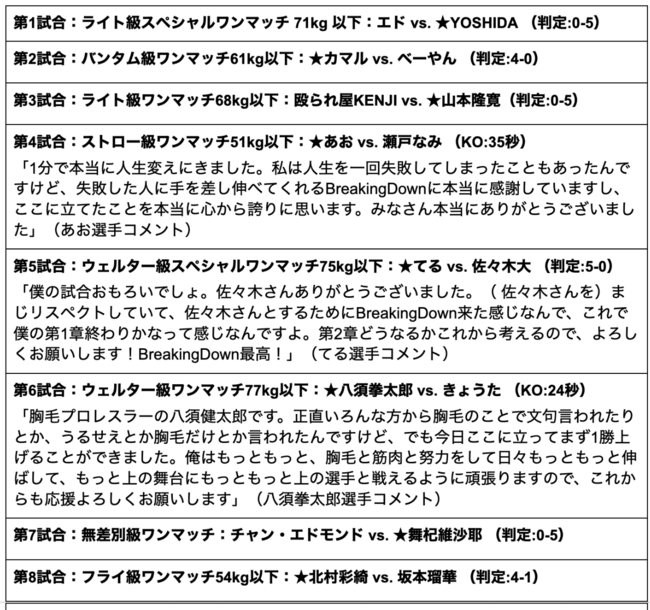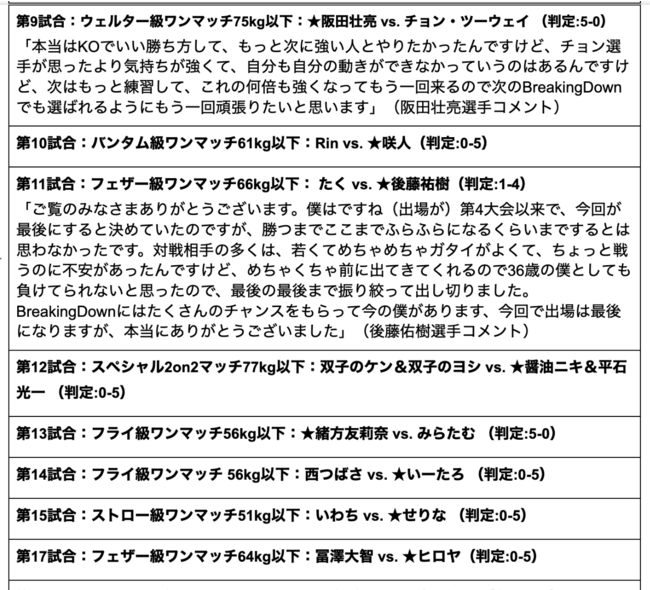 BreakingDown CEOのYUGOは「とても見応えのある試合が多く、BreakingDownで人生が変わったと言ってくれる選手がいることは大変嬉しく思っています」と語っています。
