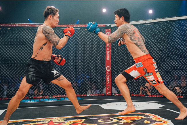 ■今大会の「ファイト オブ ザ・ナイト」に選ばれたのが、「アウトローのカリスマ 瓜田純士」選手と「岐阜の暴君ラッパー 梵頭」選手の一戦です。オーディションでできた因縁を果たすべく、バン中村との一戦を反故にしてまで決まった試合でした。瓜田選手の猛攻撃に一切下がらない梵頭選手。後半の追い上げもあり30秒の延長戦になりました。