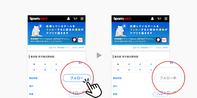 応援しているチームを「フォロー」すると、フォローしたチームの試合開始後に「スポナビ野球速報」アプリと「Yahoo! JAPAN」アプリから通知を受け取ることができます。