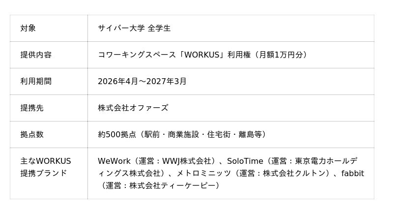 サイバー大学(学長:川原 洋、所在地:福岡市東区、以下「本学」)は、2026年4月から、株式会社オファーズが運営する全国のコワーキングスペース「WORKUS」の利用権をすべての在学生に付与します。学生は、フルオンライン学習を軸としながら、全国約500拠点に広がるコワーキングスペースを「学びと交流のリアル拠点」として活用できます。すべての在学生へのコワーキングスペース利用権付与は、国内の大学で初めての取り組みです。