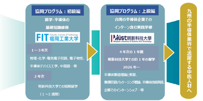 福岡工業大学は、九州の半導体業界を盛り上げ、世界で活躍できるグローバルなエンジニアを育てるために、今年度、台湾の半導体人材育成の最前線、「明新科技大学」と連携した単位交換型の協働教育プログラムを始めました。半導体受託生産最大手の台湾積体電路製造(TSMC)が熊本に進出。さらに半導体後工程受託の最大手、日月光投資控股(ASE)が北九州市への工場建設を計画するなど、九州には今、半導体をめぐる海外企業進出のビッグウェーブが到来しています。福岡工業大学と明新科技大学は、台湾の現地企業と協力したインターンシップなどを通じて、実践的かつ質の高い教育プログラムを福工大の学生たちに提供し、九州に進出する台湾の半導体メーカーや日本の半導体関連企業で活躍できる実践的な中核人材を育てます。取り組みを取材いただけたら幸いです。よろしくお願いいたします。